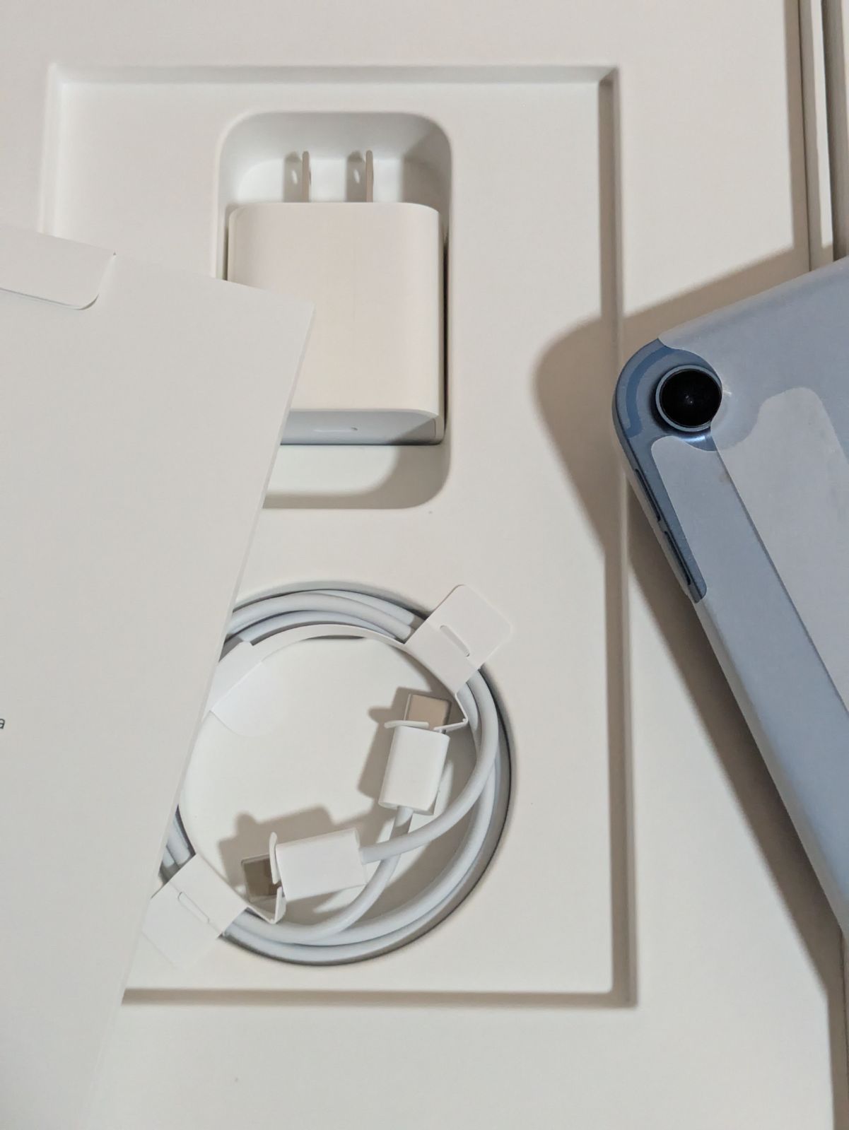 付属品完品。充電アダプタとケーブルも未使用となります。
