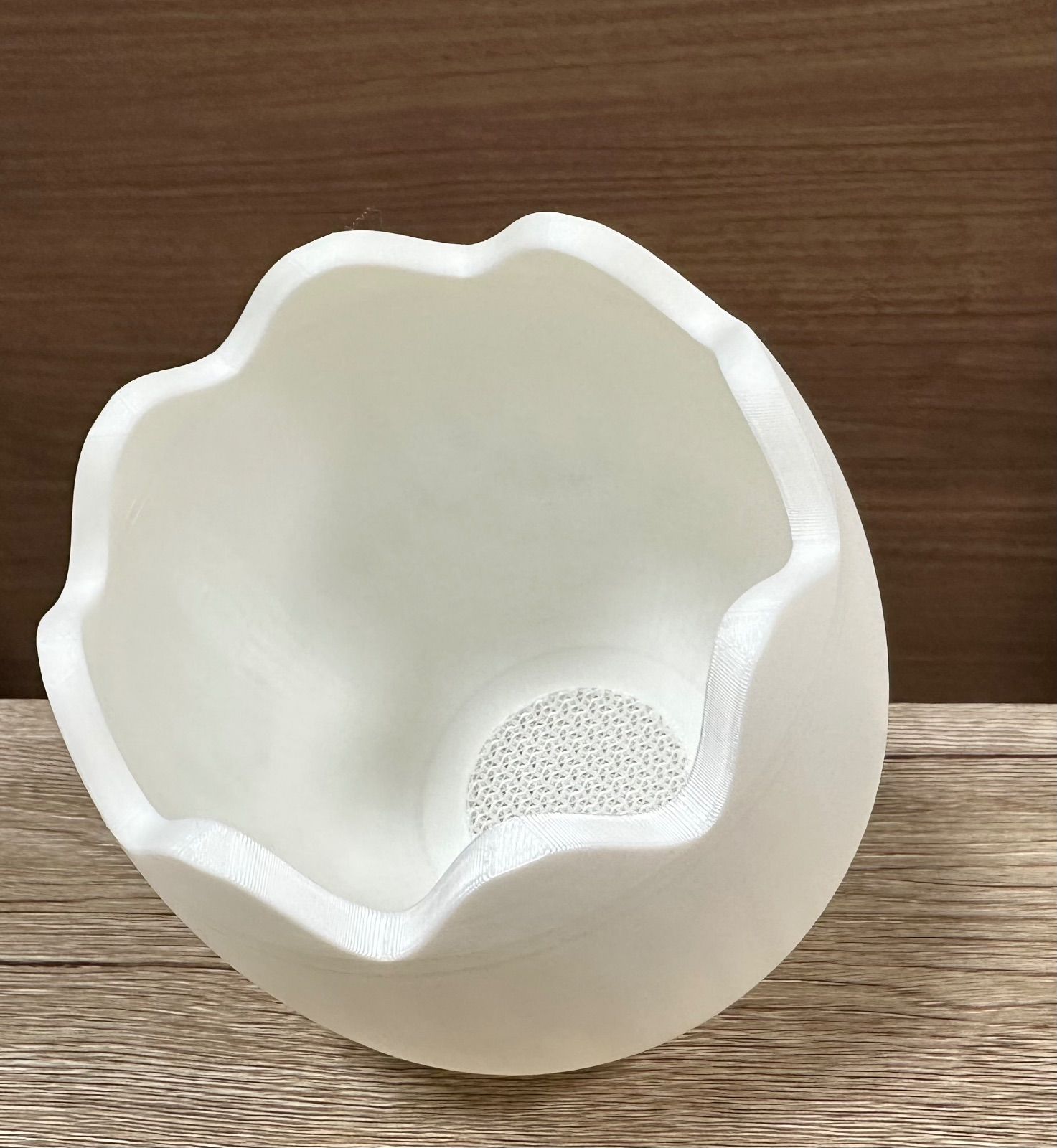 3Dプリンターを使って製作した白い卵形の植木鉢です。