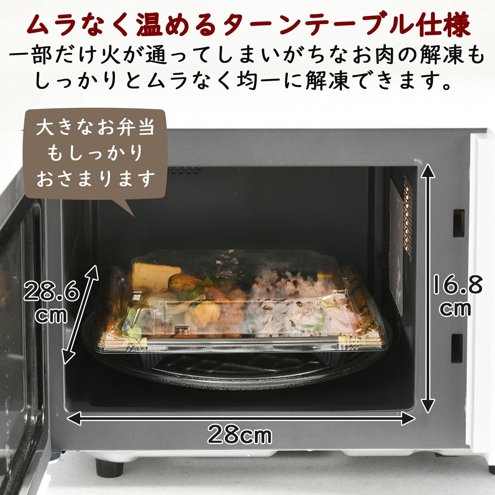 【ターンテーブル】料理がムラなく均一にあたたまるターンテーブルタイプ。ごはんやお惣菜のあたためはもちろん、一部だけ火が通ってしまいがちなお肉の解凍もしっかりとムラなく均一に解凍できます。