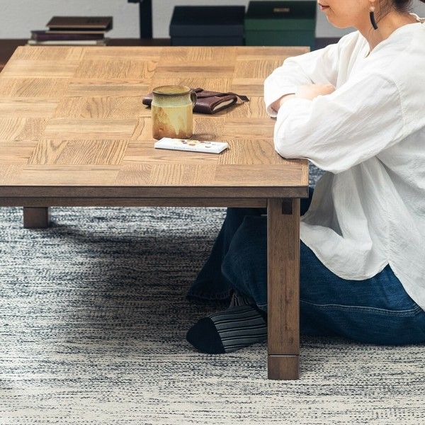 オーク突板を使用したブロック調天板が特徴のカジュアルこたつ。使い込んだようなヴィンテージ風ミドルブラウン色で、リビング空間の主役になるような存在感があります。こたつ布団を外してオールシーズン使えるよう、脚部まで丁寧にデザインしました。脚の掘り込み(溝)もワンポイントです。また、脚を天板より内に入れたデザインに拘っています。これにより一番の特徴の天板が強調され、シルエットをすっきり見せる効果もあります。サイズは2〜4人づかいに丁度よい120幅・135幅です。お手入れも簡単なので、気兼ねなくお食事も可能。〜4人程度で囲んで、食卓としての毎日づかいにもぴったり。●スペック・UV塗装で仕上げた天板はマット寄りな美しい光沢感があります。 塗膜の固い塗装のため、天板にキズが付きにくいです。 水拭き可能でケアしやすく、特別なお手入れも不要。・コード収納付き・継脚1段付き(高さ約5cm)・便利な電子手元コントローラー付きで、手元でも電源入切/温度調節が可能です。・電線・綿糸をよりあわせた丸打ちコードタイプ。引っ張り・圧縮などのストレスに強く丈夫。 U字型ヒーターで効率よくこたつ内を温められます。【ご注意】・お客様組立商品です。・商品写真はこたつヒーターのない状態で撮影をしています。 実際にはヒーターが付いた状態でお届けいたします。・写真は全て120幅です。