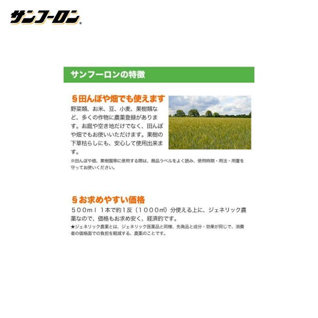 サンフーロン液剤は、1994年(平成6年)10月20日に、農林水産省登録第18814号の農薬登録をいただいた、除草剤です。