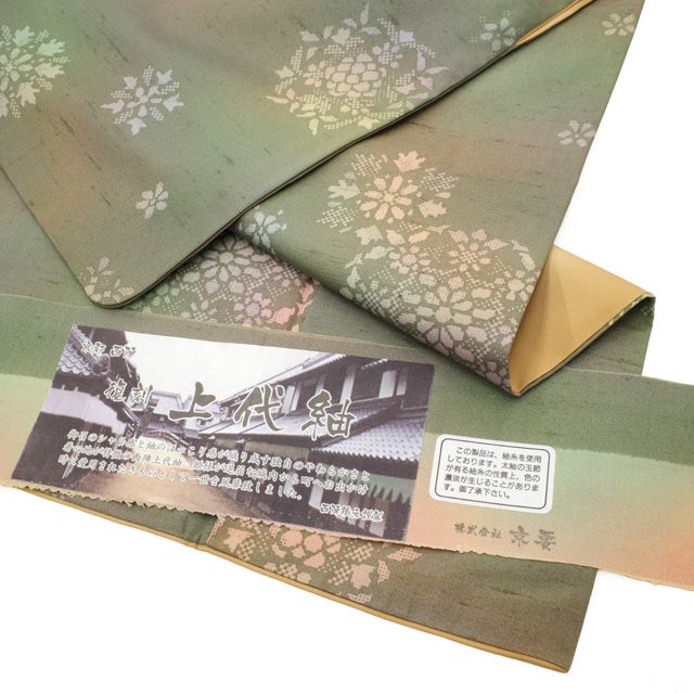 【新古品】 紬 着物 未使用 正絹 復刻 上代紬 京都 西陣 京要 染め柄 灰緑ぼかし グリーン系 モダン 華文 かわいい お洒落 カジュアル つむぎ 春 秋 冬 美品 仕立て上がり 身丈166 裄丈68.5 Lサイズ みやがわ sb16464