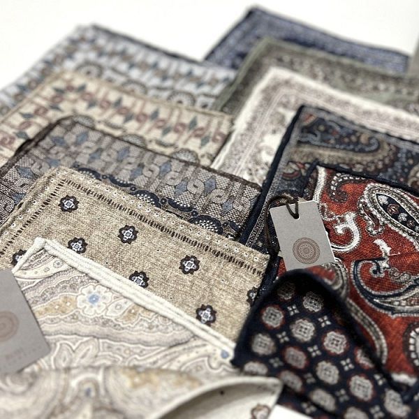 イタリア・アレッツォの職人たちが、一枚一枚、手仕事の温もりとともに仕立てたポケットチーフ。