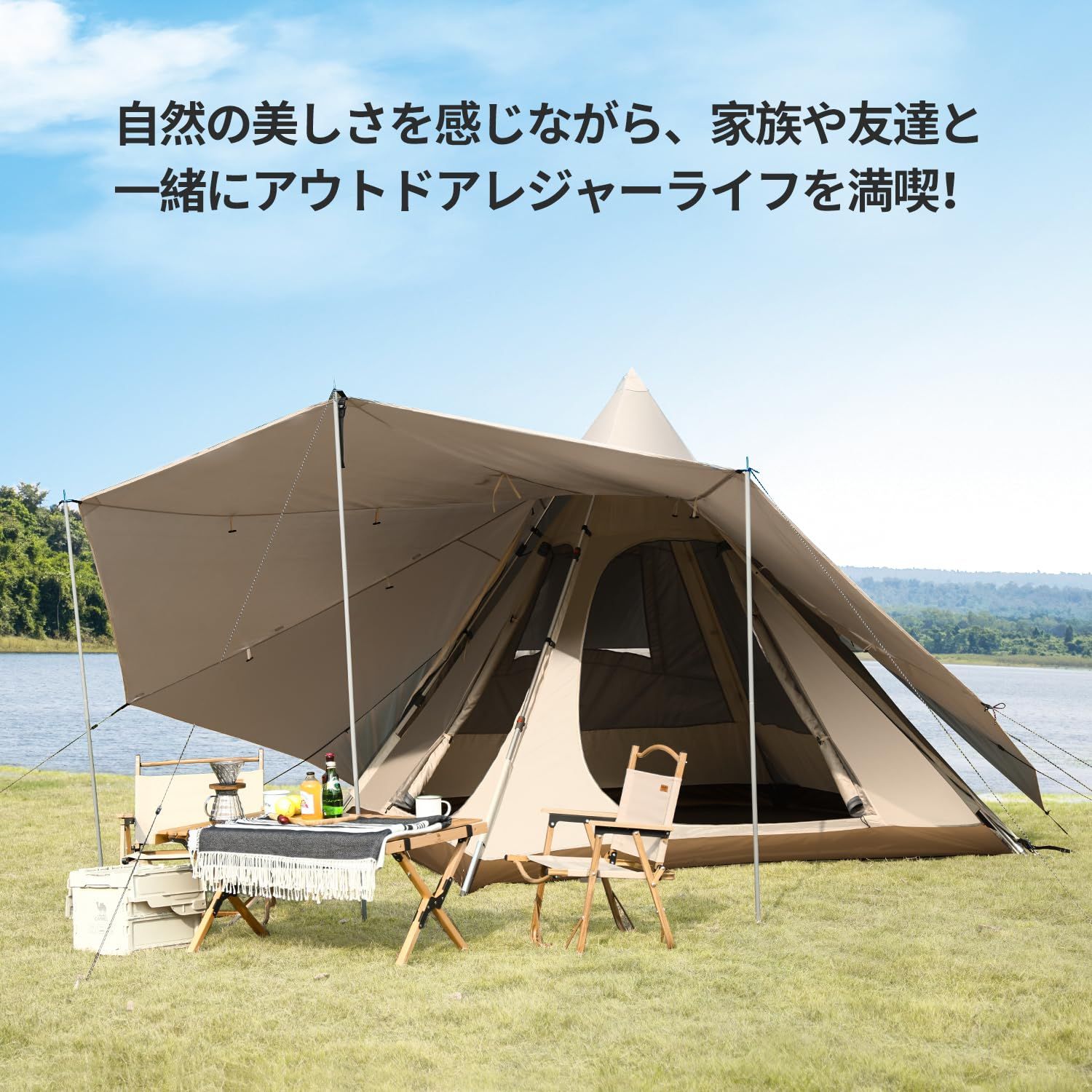 CROWN 大型テント 二重層キャンプテント 5 6人用 ファミリー CAMEL ピラミッド型 UVカット サンシェード UPF 50 日焼け対策 PU 3000 mm 防水防雨