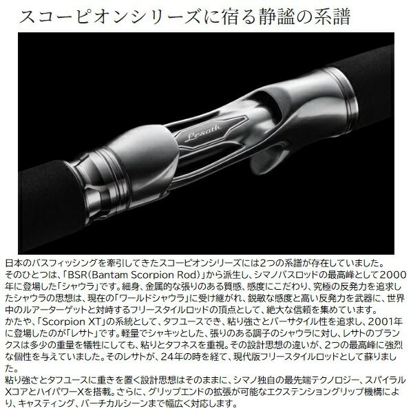 気品に満ちた輝きは、漆黒に煌めく星の瞬き。フリースタイルフィッシングをもっと優雅に、そして親しみやすく。レサトは、世界中のルアーフィッシングアングラーにとって扱いやすいと感じるキーワード「振りぬきやすさ」と「操作性」を追求し、瞬間的なしなやかさと収束の速さを共存させた、独特な軽量ミドルレスポンスブランクスに辿り着きました。貴方はひとたびロッドを手にした瞬間から、そのロッドバランスの良さに驚くことでしょう。そしてレサトが実現したもう1つの機能が、全モデルに付属された「エクステンショングリップ」。ワールドシャウラ・スコーピオンシリーズで培ったグリップ交換によるフィッシングスタイルの拡張機能エクステンションバット構造を、追加購入なしで実現。ロッド後端のエンドパーツを締め込み、しっかりと固定することでリールの付け替えなしでグリップレングスを150mm延長することが可能となり、キャスティングシーンとジギングシーンといった2つの異なるゲームを1本でお楽しみいただけます。
