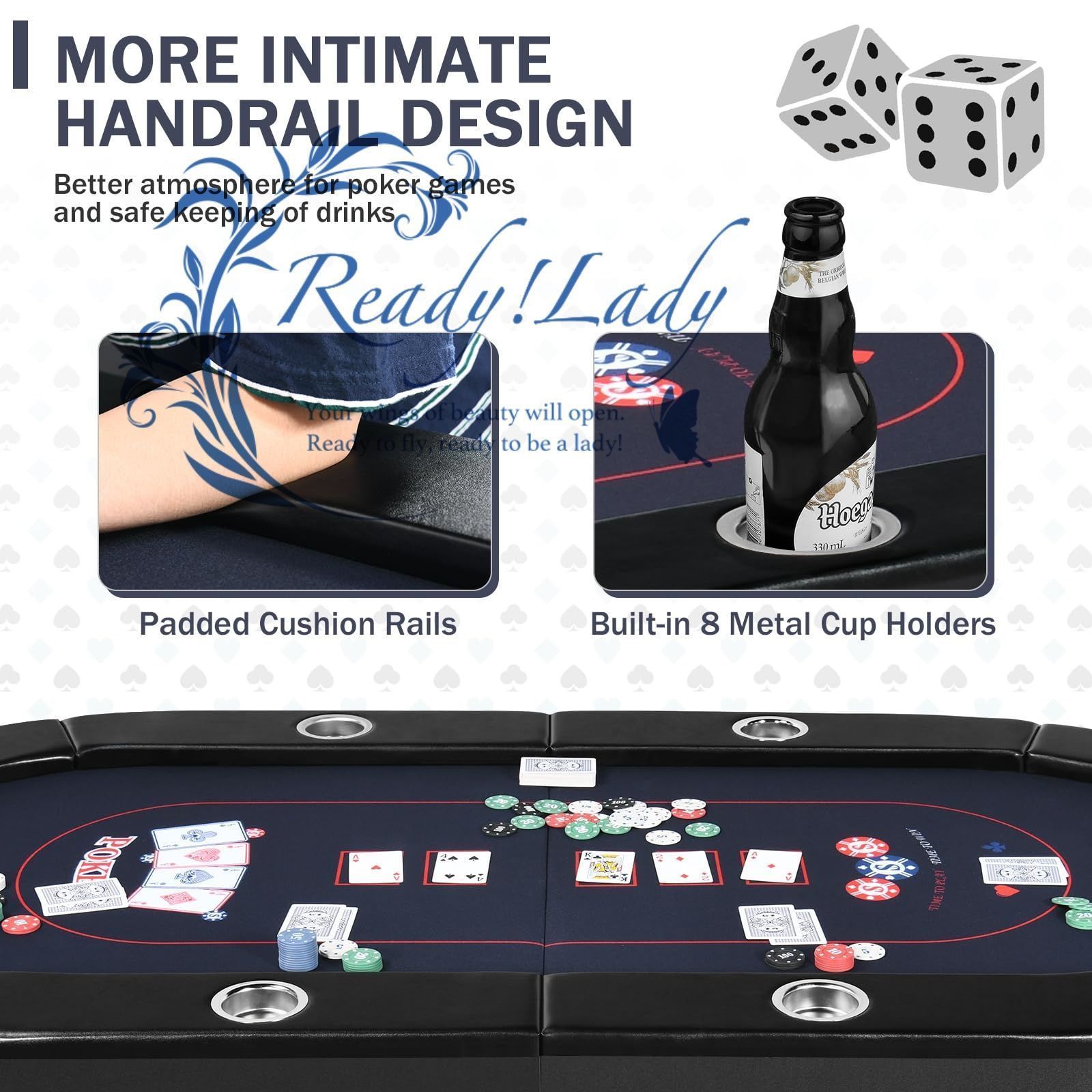 【フェイクレザーパッド入りアームレスト】カジノグレードのネイビーブルーのフェルト表面とカジノスタイルのパッド入りアームレストを備えた8人用ポーカーテーブルトップは、ゲームセッションがどれほど遅くても快適に腕を休めることができます。