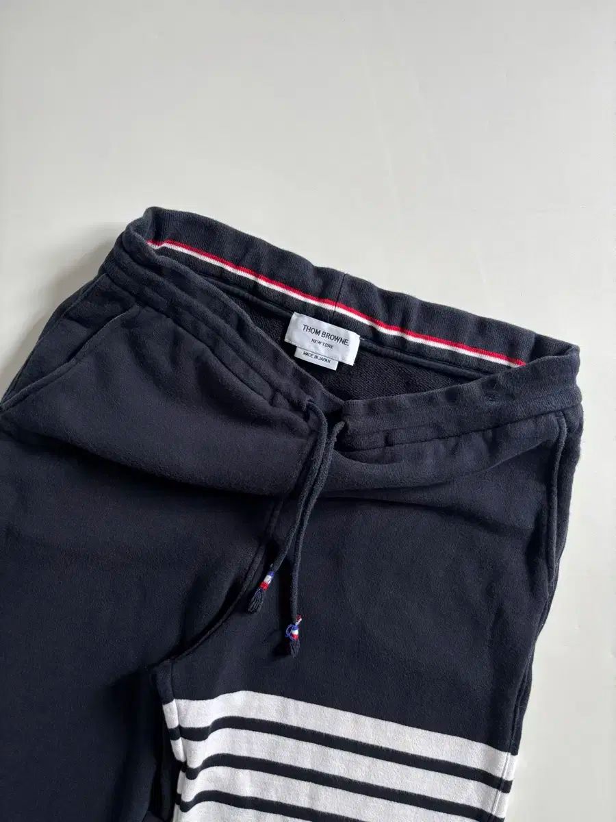 人気のネイビーカラーに、トム・ブラウンの象徴的な4本線ストライプ、裾部分に特有のタグがあります。