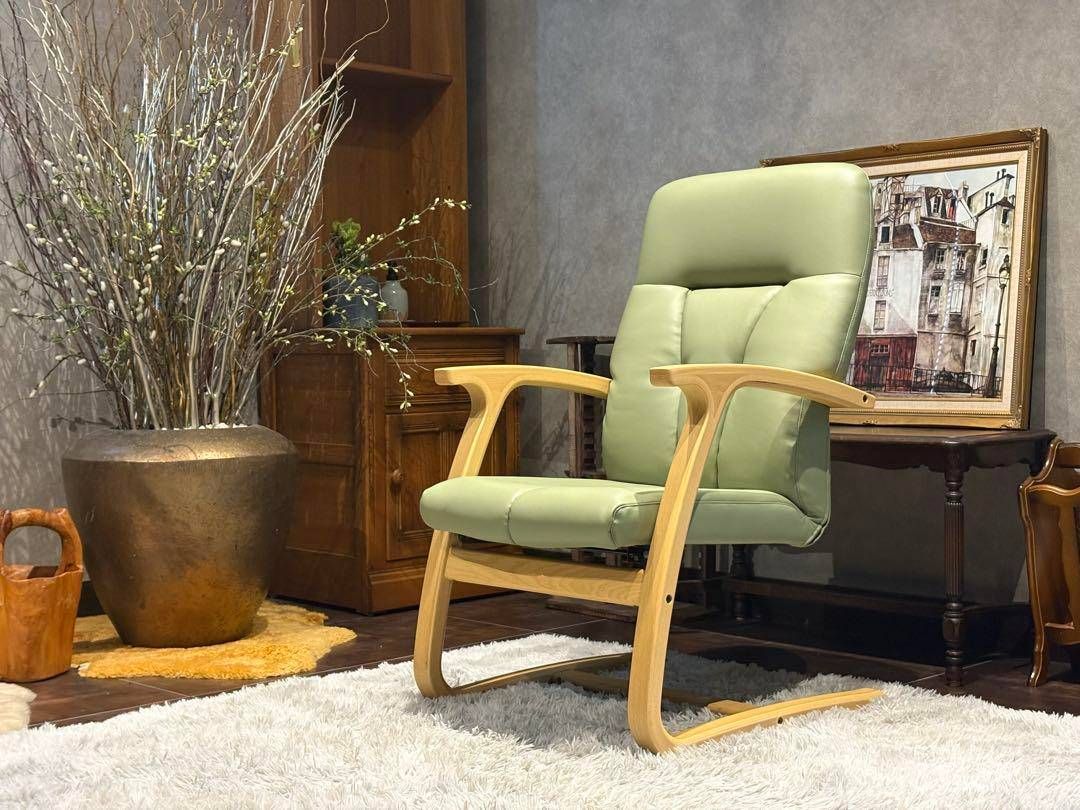 落ち着いたスモークオリーブグリーンのレザーが特徴で、木製フレームとの美しい調和を感じられる一脚。