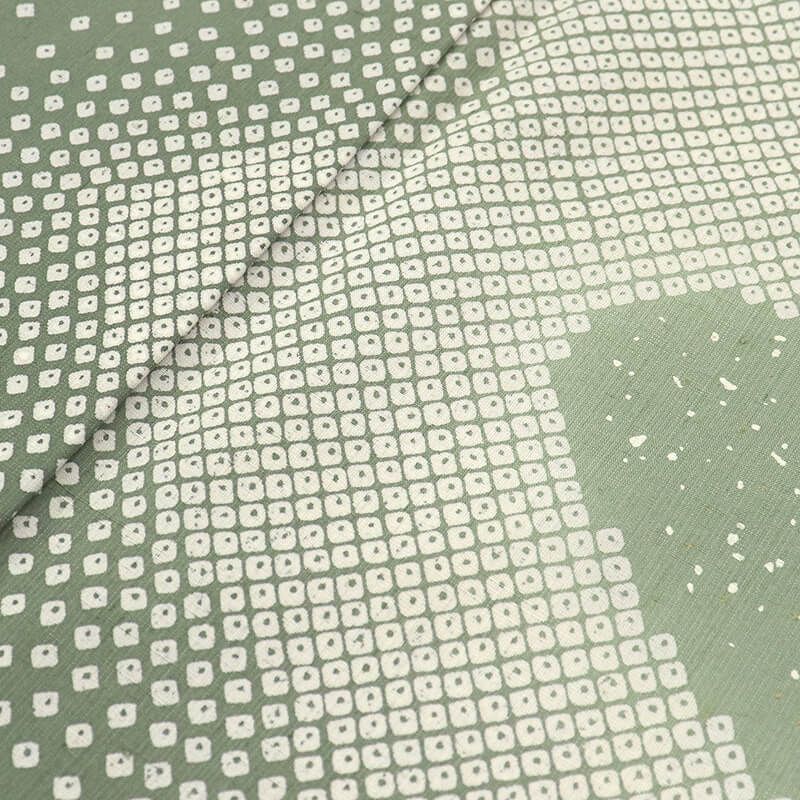 優しい薄緑色に、散らしと裾には鹿の子柄で表現された流れる柄が素敵な紬付下げ。裾にかけて、鹿の子柄の大きさで濃淡が表現されており、品の良い装いに。八掛は表地と同じ緑色。上品で、お地味になりすぎない色柄が素敵です。落款が入っております。
