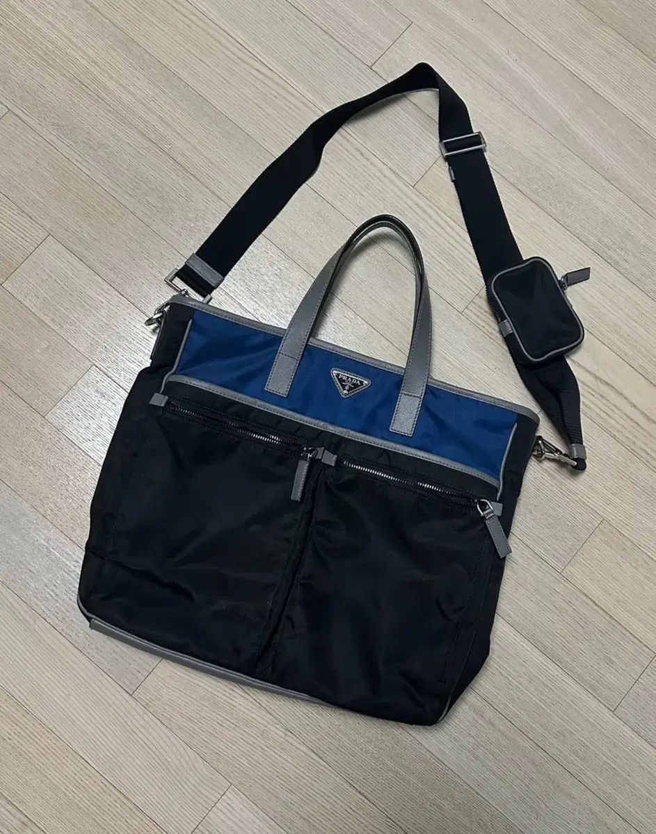 ネイビーとブラックのツートンカラーのプラダクロスボディバッグです。十分な収納スペースがあり、用途が広く、取り外し可能な小さなポーチも付いています。目立つ使用感もなく、全体的に綺麗な状態です。