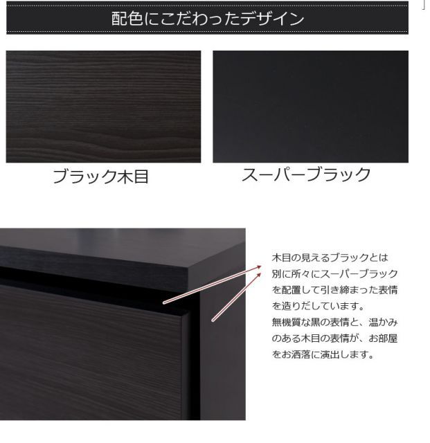 ■商品について/オールブラックで仕上げたキャビネットは風格のある存在感。細脚からスタイリッシュに完成されたスクエア感は直線的で黒木目とマッチ。扉・引出しの構成のキャビネットやローボードに機能的なデスクタイプも加わりリビング空間をカッコよく演出。ソリッドブラックな脚部や細部に木目の効いた表面材が絶妙なバランス。引出しはスライドレール付き