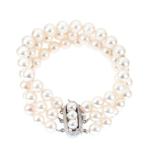 径約7.1-7.4mmのアコヤ真珠を贅沢に使用した、豪華なブレスレット。パールは、特有の地肌の荒れが僅かに確認できますが、ほのかにピンク味を帯びたテリのあるホワイトカラーのものがセレクトされています。たっぷりと敷き詰めた三列のラインがエレガント。ほどよい重厚感も魅力の、ラグジュアリーなパールジュエリーをお楽しみください。