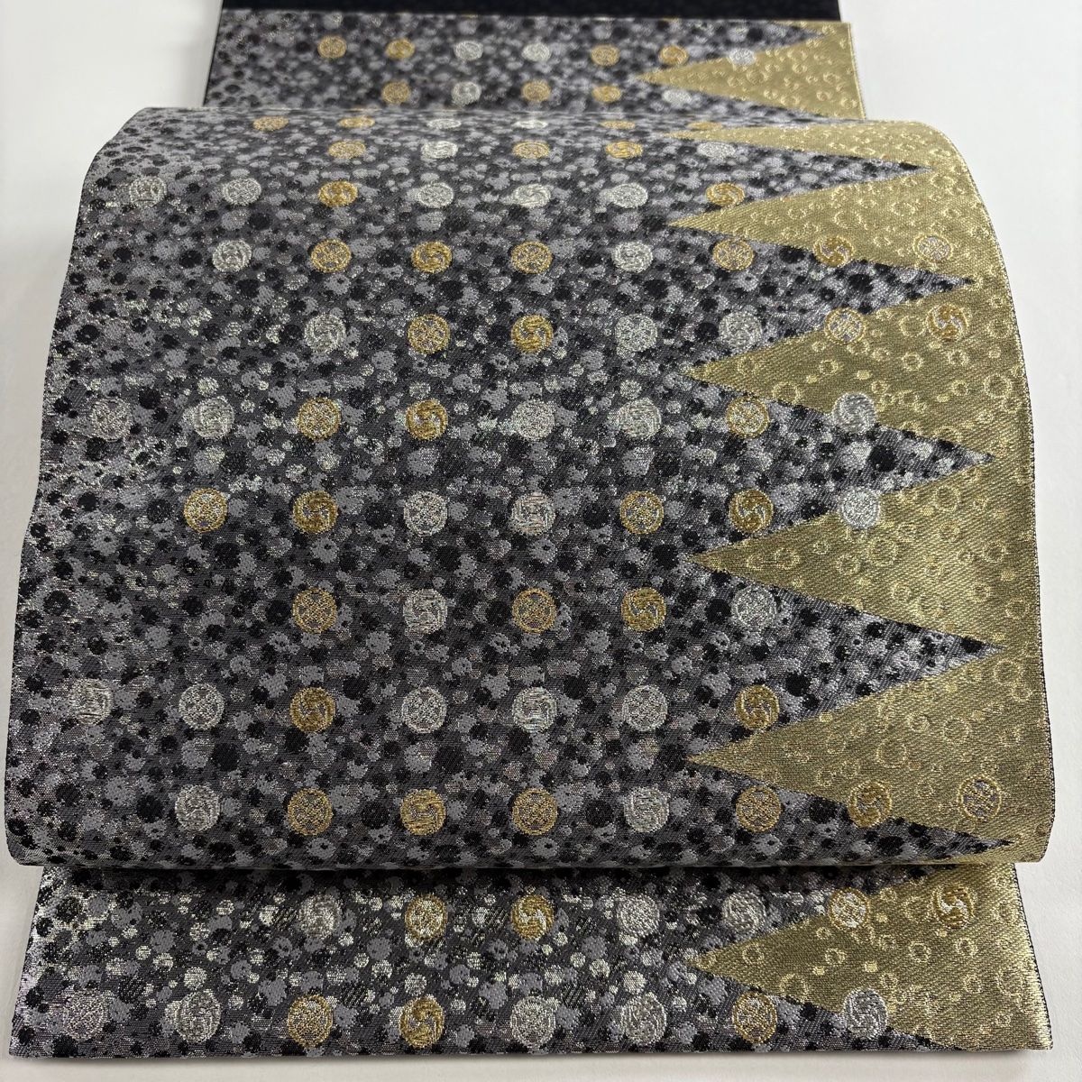 袋帯 じゅらく 落款 幾何学模様 金銀糸 箔 灰色 六通 正絹