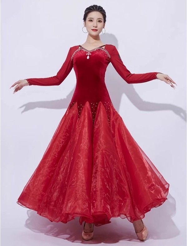 社交ダンスドレス 社交ダンス モダンドレス 大きいサイズ 長袖 広がる裾 スタンダードドレス ワルツダンス ワンピースドレス ダンス衣装 ダンスウェア ステージ衣装 競技会 カラオケ デモ パーティー 発表会 競技着 練習着 舞台 演奏会 演出 黒 赤S1M3