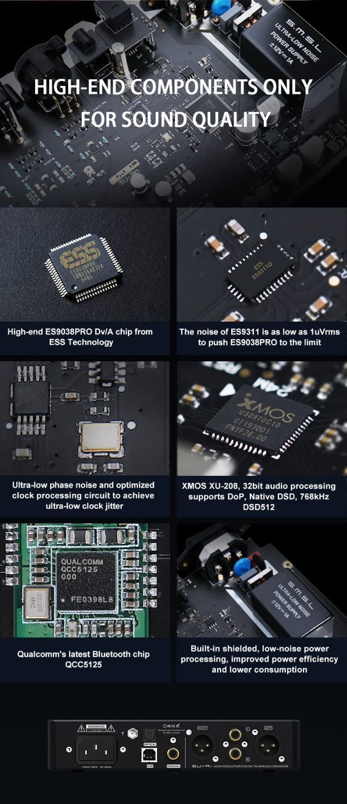 ESS会社のハイエンドD/AチップES9038PROを使用する:ESS会社の高性能DAC専用パワーチップES9311の採用により、電源ノイズは1uVrmsと低く、ES9038PROの性能を限界まで引き出しています。