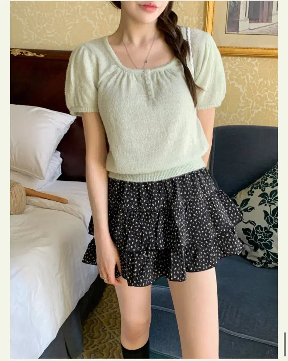 パフ 半袖 ニット フラワー ミニ スカート モダンローブ