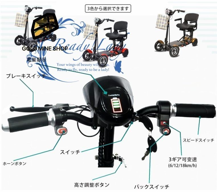 【電動車椅子の情報】サイズ(cm):展開55cmX95cmX95cm おりたたみ:55cmX38cmX75cm 重量(kg):38kg 耐荷重:150kg、 前輪10インチ、後輪8インチ、最高速度は:(km)18km/h、ノーパンクダイアであらゆる道路に適応し、パンクや空気漏れの心配を取り除きます。
