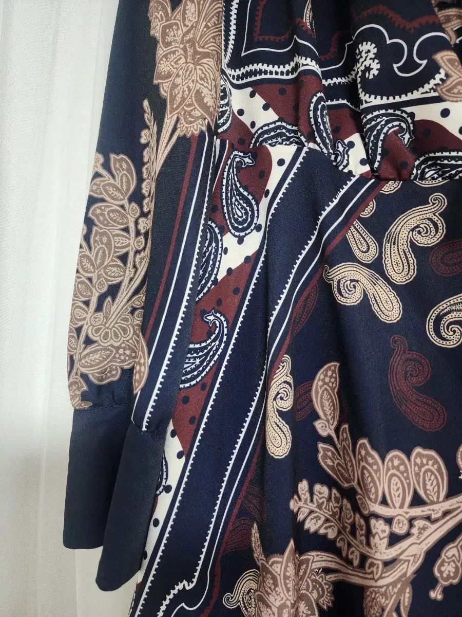 これはZOOCペイズリーロングドレスです。ネイビーの背景のペイズリー柄は豪華です。ネックラインにはストラップが付いているので、リボンと一緒に着用することもできます。