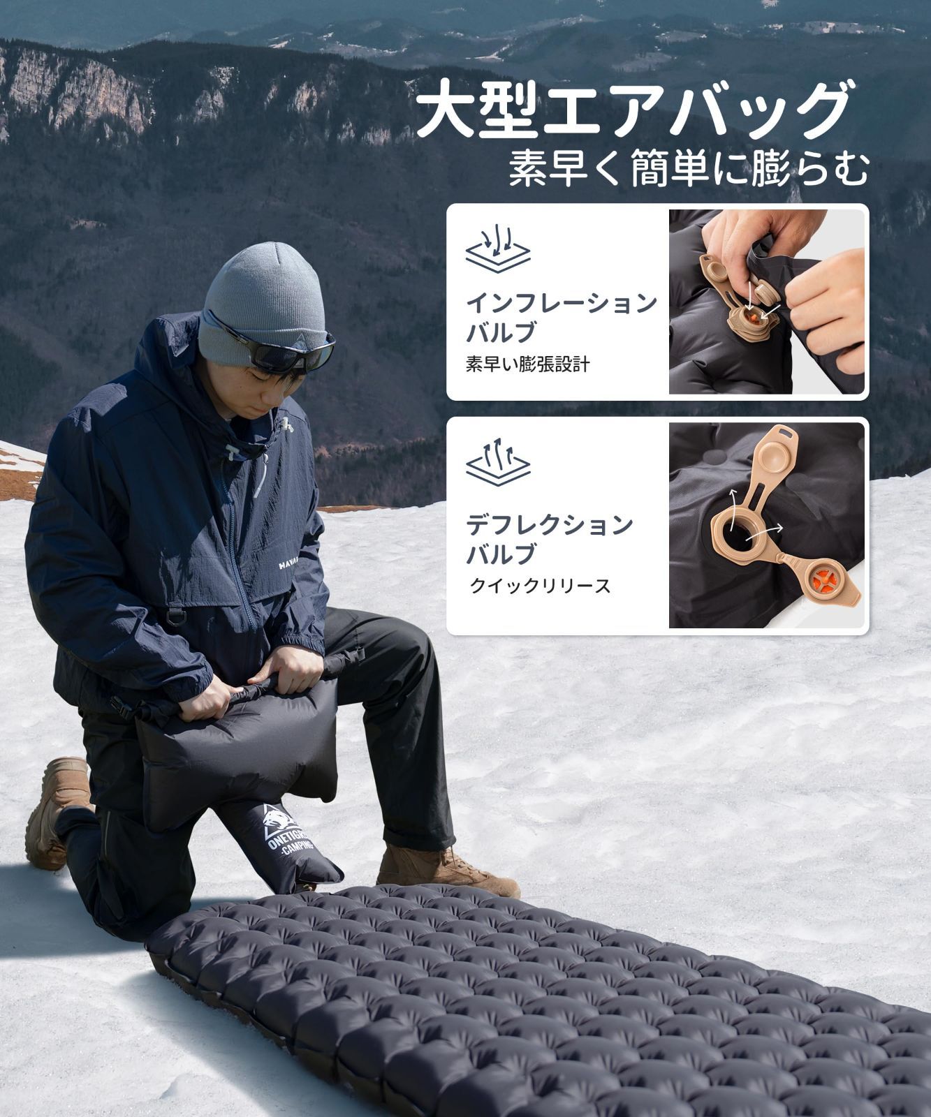 【大型サイズ・クッション性いい】独特設計のミイラ型デザイン、ONETIGRIS冬用エアマットのサイズは約197*65*10cm、より大きく、広く、厚みがあるます。睡眠姿勢のサポートポイントに基づき、体にフィットする立体パッドを作り出し、高い弾性と耐圧性を備えます。柔らかな支えを提供しながらリラックスした快適な睡眠を実現します。厚さは10cm、睡眠中の床との接触を防ぎ、保温性を高め、優れたクッション性を提供し、ユーザーは安心感と快適さを感じられます
