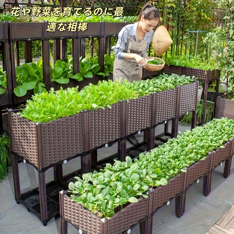 ガーデニングをより手軽に、そして快適に楽しめる脚付きプランターボックスです。腰をかがめる負担を軽減し、ベランダや庭を素敵な空間に変えます。花、ハーブ、野菜など、様々な植物の栽培におすすめです。