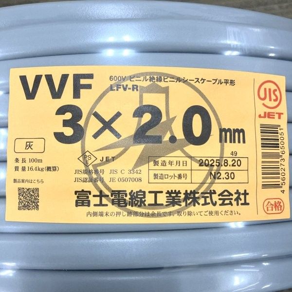 富士電線 VVFケーブル 3×2.0mm 灰色 100m 黒白赤