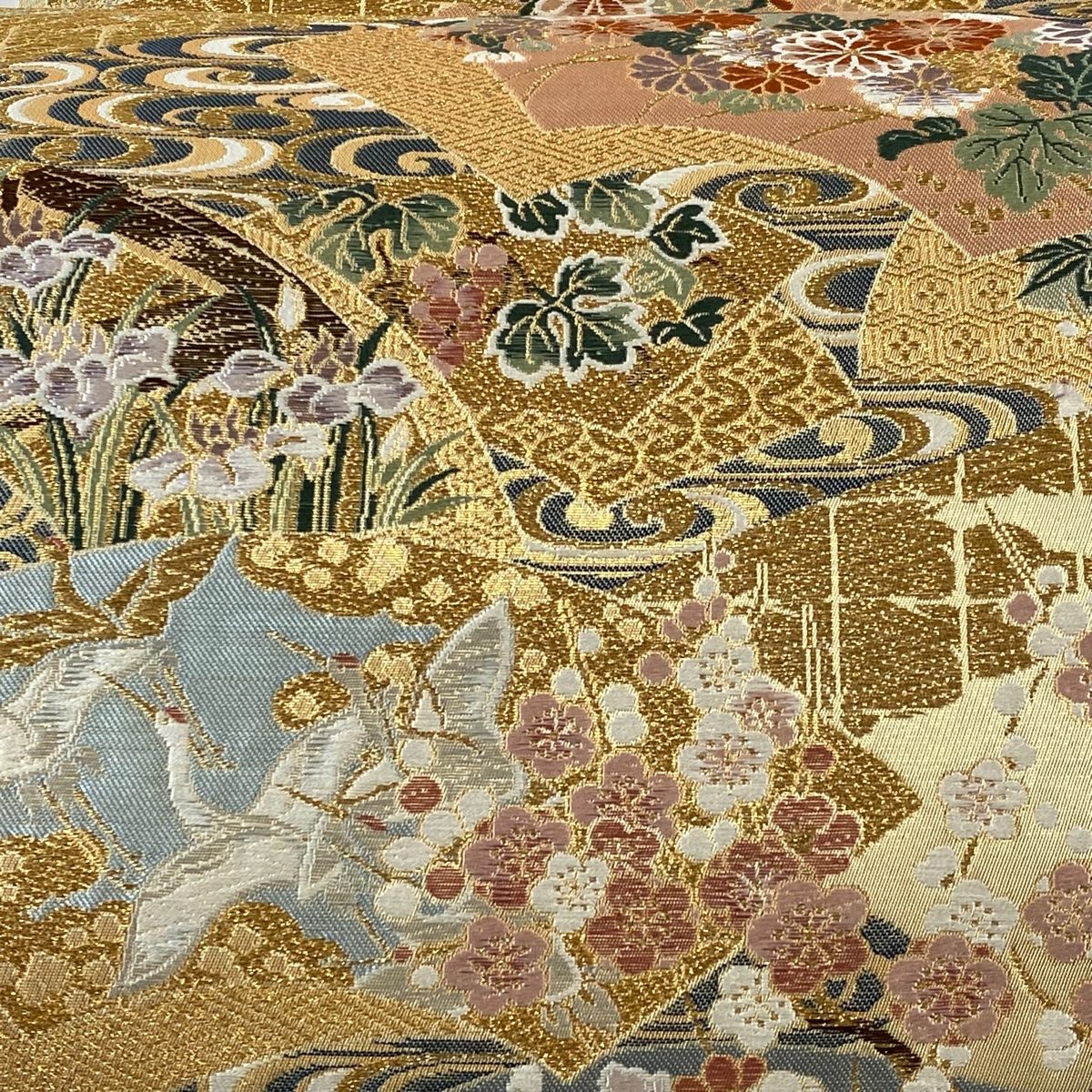 袋帯 秀品 扇面 花鳥 金糸 箔 ベージュ 六通 正絹