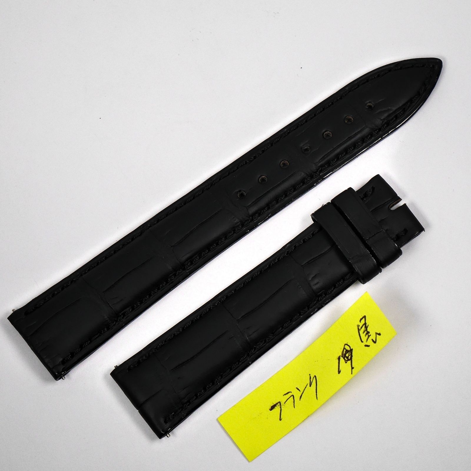 黒色のクロコダイル (ワニ革) を使用した高級レザーストラップ。表面に特徴的な鱗模様が入り、ステッチが丁寧に施され、耐久性と上品さを兼ね備えています。