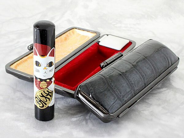 印鑑 銀行印 ケース付き セット はんこ 黒水牛印鑑 開運 蒔絵 ネコ 千客万来 12 mm 認印 牛革 型押し シャイニングクロコ 印鑑ケース 朱肉付き 旧字 特殊文字 作成 OK プレゼント ギフト