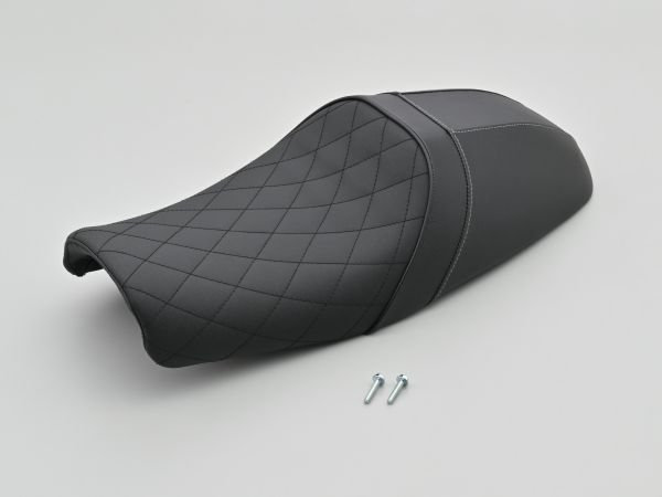 セパレートハンドルなど低めのポジションにフィットするカフェスタイルシート。前傾姿勢に合わせて、着座位置も少し前よりに設定しています。シート高はノーマル比で約-10mmとダウン量は少なめながら、ライダー側の座面幅を狭めて肩もなだらかに落とすとことで、数値以上に足つき性も向上します。このシートが揃ったことで、大好評のコンセプトモデル「GB350カフェ仕様」をボルトオンで完全に再現できるようになりました。