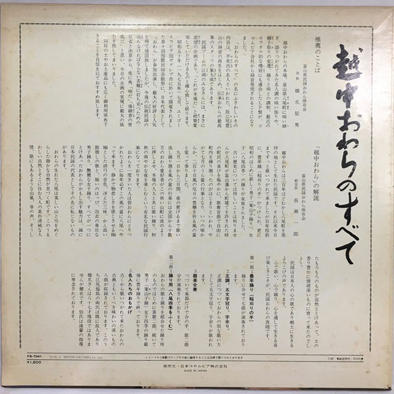 超激 !! 伝説級 富山県民謡おわら保存会 越中おわらのすべて LP Columbia FS 7041 原盤 橋爪儀平 江尻豊治 福島佐久一 伯育男 富山民謡 郷土芸能