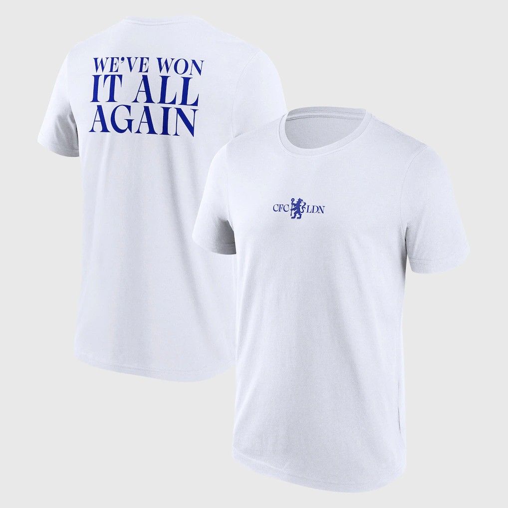 チェルシーの最近の勝利を祝うクラシックなTシャツです。胸にはクラブクレストと「CFC LDN」のグラフィックが、背面には「We’ve Won It All Again」の boldなテキストがプリントされています。レギュラーフィットで快適な着心地なので、普段使いにも最適です。
