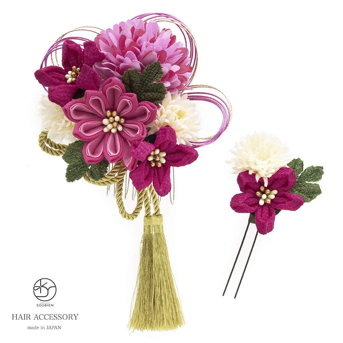 在庫 つまみ細工2点セット 成人式 菊 卒業式 ピンポンマム 水引 髪飾り 組紐 ちりめん ソウビエン 房飾り SOUBIEN assort-kaz 0054