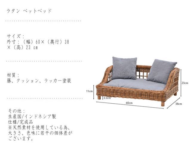 説明材料にラタンを使用して自然の風合いを味わえるペットベッド。熟練職人が手間隙をかけてひとつひとつ丁寧に手編みによってつくられています。熟練のラタン家具職人によりしっかり編まれているので、安定感のある丈夫なつくり。またラタンは軽いので移動も簡単にできます。