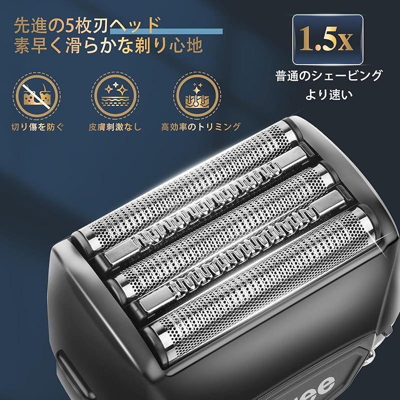 【5枚刃ヘッド・高精度網刃】顔にフィットする5枚刃は、顔の形やシェービングの動きに合わせて密着シェービング。合計42500回転に達する回転速度は、五枚刃電動シェーバーによる大面積のシェービングに合わせて、高効率で滑らかな剃り心地や肌を刺激から守りながらパワフルな剃り心地を実現する。 また、この髭剃りシェーバーはニーズに合わせるシェービングのために、もみあげトリマーも付属している。