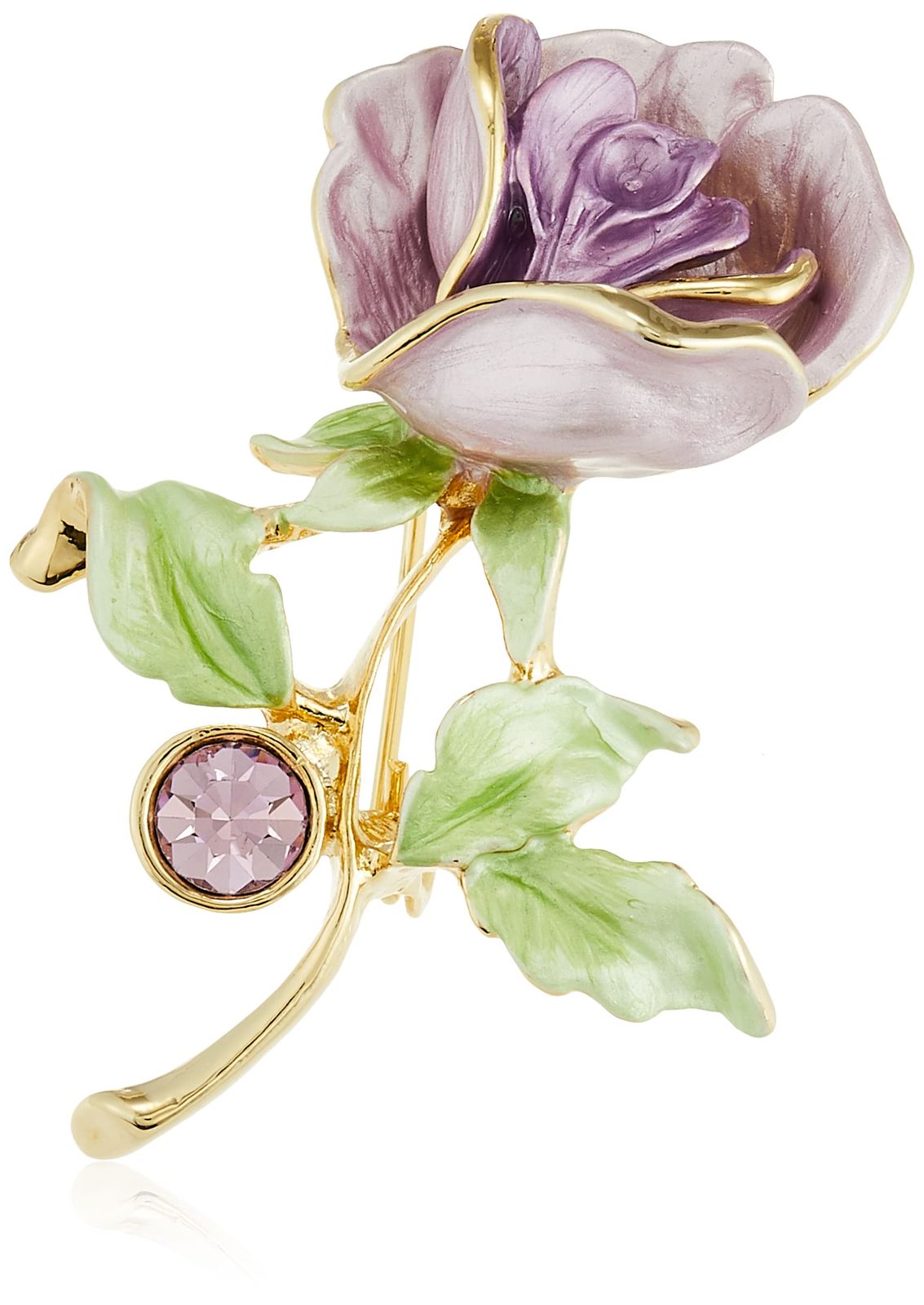 エレガントな一輪のバラブローチ。バラの柔らかな曲線を表現した花びらは、ペールトーンの優しい色合いで上品さに溢れています。カットガラスの輝きをポイントに、胸元をエレガントな印象に仕上げます。パープルのバラの花言葉は「しとやか」「上品」大切な方への贈り物にもぴったりです。